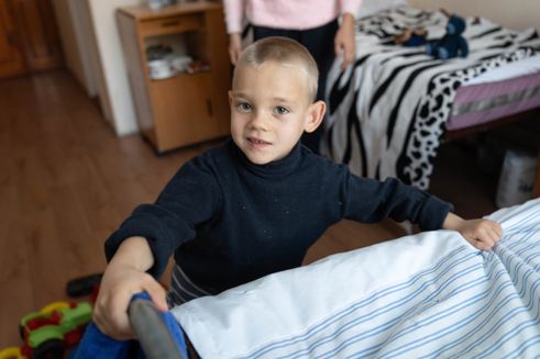 6-årige Leonid er født med cerebral paresse. Han kan kun gå på sine tåspidser, når han skal bevæge sig rundt. Derfor bor han med sin mor på børnehospitalet i Mykolaiv. Det skal de gøre, indtil Leonid er blevet opereret 2-3 gange.