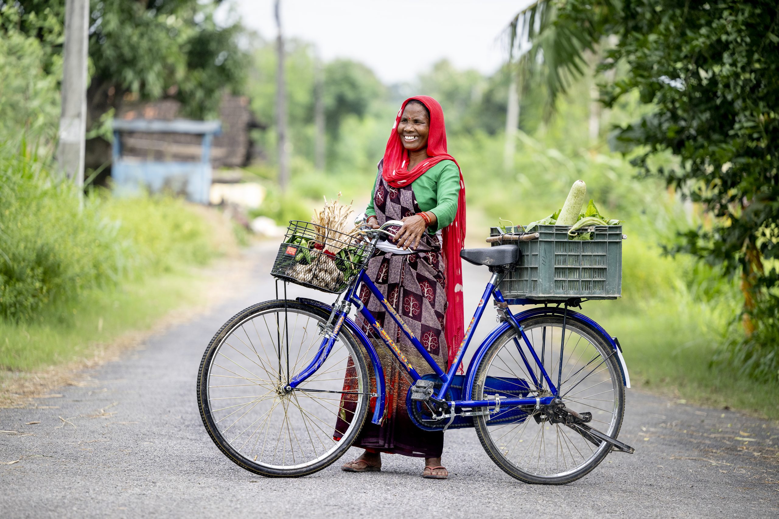 Det var begrænset, hvor meget jeg kunne bære på hovedet, men efter jeg har fået cyklen, kan jeg transportere mange flere grøntsager ind til markedet, og på den måde sælger jeg også mere.Ram Kumari Rana Tharu modtog en cykel i 2023
