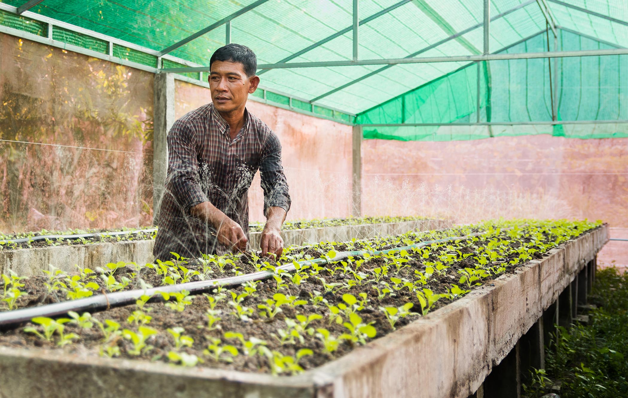 I køkkenhaverne gror afgrøder, som ikke kræver store mængder vand. Når der skal bruges vand til afgrøderne, kommer det ofte fra solcelledrevne vandsystemer, som familierne i landsbyen deles om.
