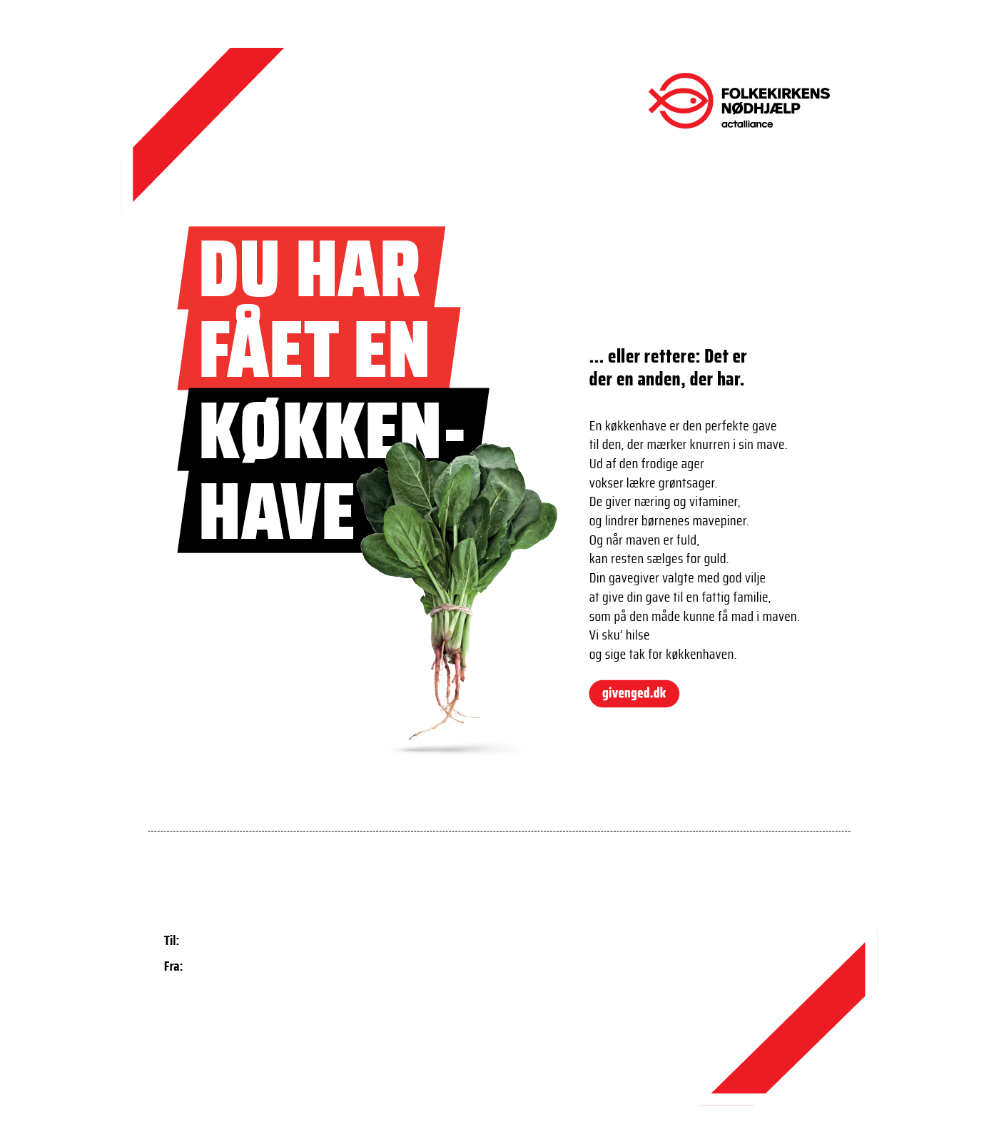 Enhver gave du køber, støtter Folkekirkens Nødhjælps arbejde til fordel for mennesker i nød rundt om i verden. Alle gaver fungerer som en donation, og vores lokale partnere bruger pengene til det specifikke program eller projekt, som gavebeviset angiver – i dette tilfælde er det Folkekirkens Nødhjælps køkkenhaveprojekt. Din donation er således bundet til det særlige formål, du gerne vil støtte