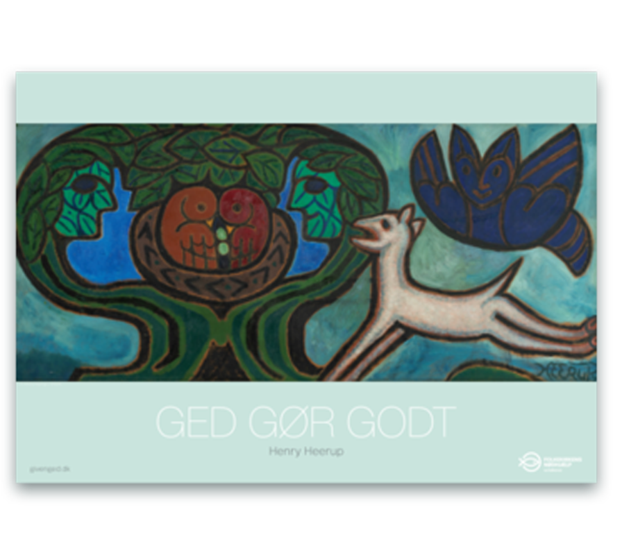 Den populære velgørenhedsgave ”Giv en ged” kan du købe som kunstplakat med motiv af kunstneren Henry Heerup. Alle pengene går ubeskåret til Folkekirkens Nødhjælps ”Giv en ged”-projekter i verdens fattigste lande.