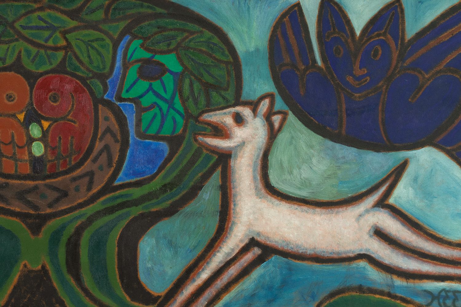 Motivet er et genoptryk af maleriet ‘Fugl i rede – hvid kat’ med tilladelse fra Heerup Museum.